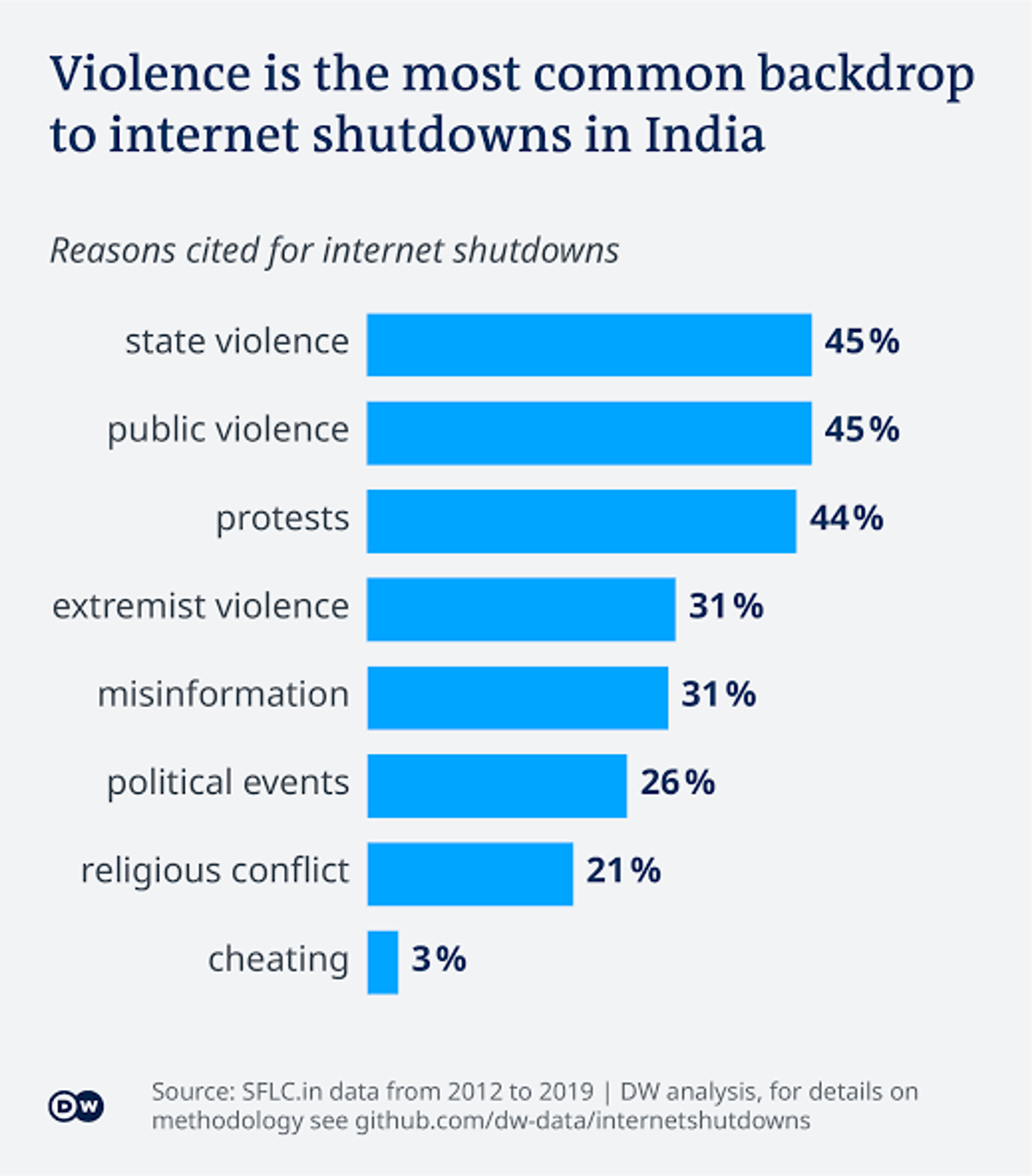 Though the central government has never ordered a nationwide internet shutdown, India still tops the list of internet shutdowns globally. The Software Freedom Law Centre’s tracker states that there have been about 381 shutdowns since 2012, out of which 106 were in 2019 alone. The 2019 shutdown of Jammu and Kashmir is recorded to be the longest ever in any democratic country. The UT experienced an internet shutdown which was 552 days long from August 4 2019 up till February 6, 2020. Internet access at this time was either non-existent or only at 2G speeds.