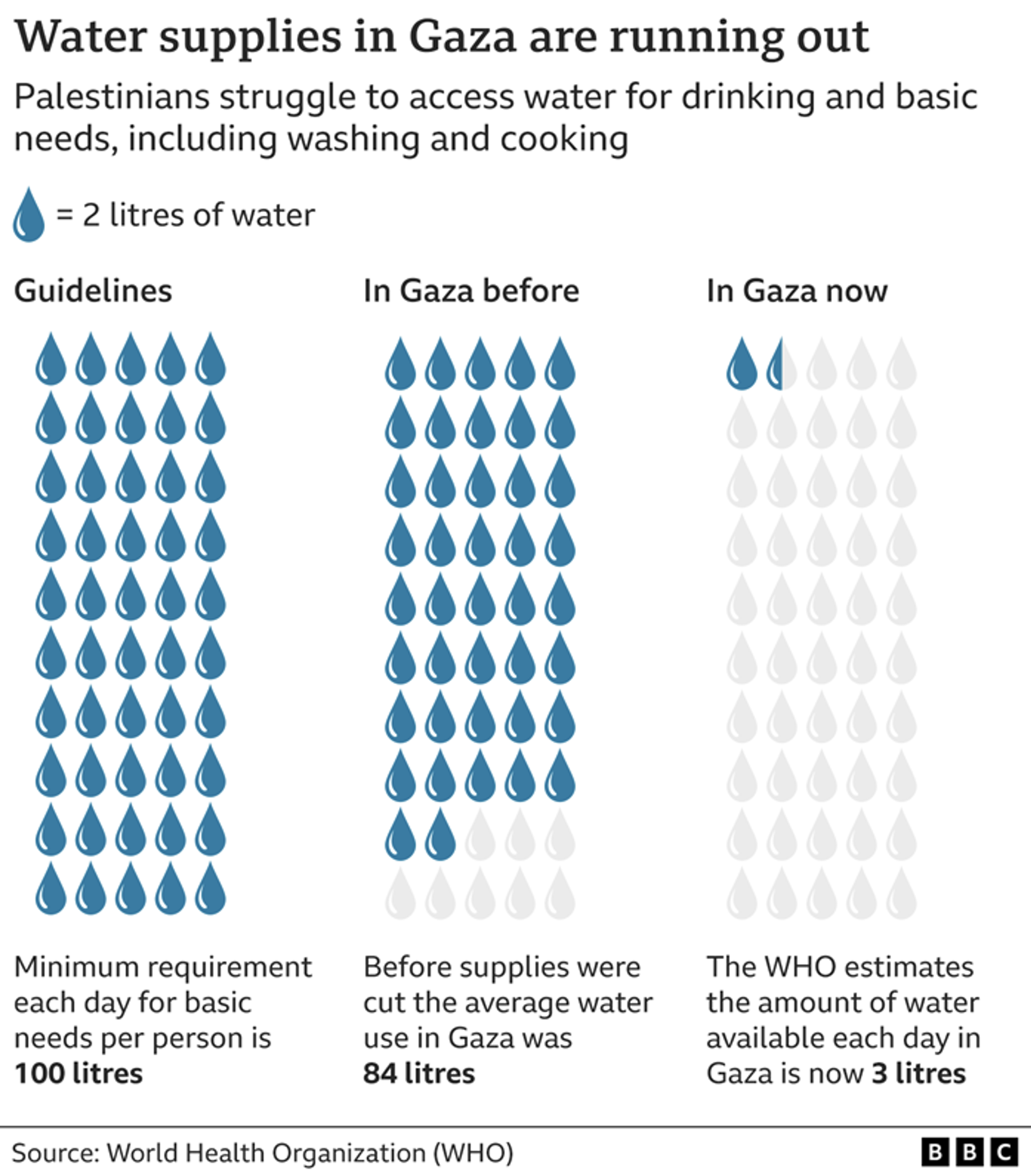 Because of the “complete siege” announced by the Israeli Prime Minister, Benjamin Netanyahu, Israel has control over electricity, food, water, and fuel. Clean water is already scarce and Israeli airstrikes are destroying water infrastructure. WHO sets the minimum requirement for daily water needs at 100 litres per person but the average water consumption in Gaza has reduced to just three litres per person, estimated by WHO. The border has been opened a couple of times to send around 20 trucks carrying food, water, and medicine – but no fuel – into Gaza. To try to get around the blockade, Hamas built a network of tunnels that it uses to bring goods into the Strip from Egypt. Israel says militants also use the tunnels to smuggle weapons and move around out of sight and so it is frequently targeted by airstrikes.