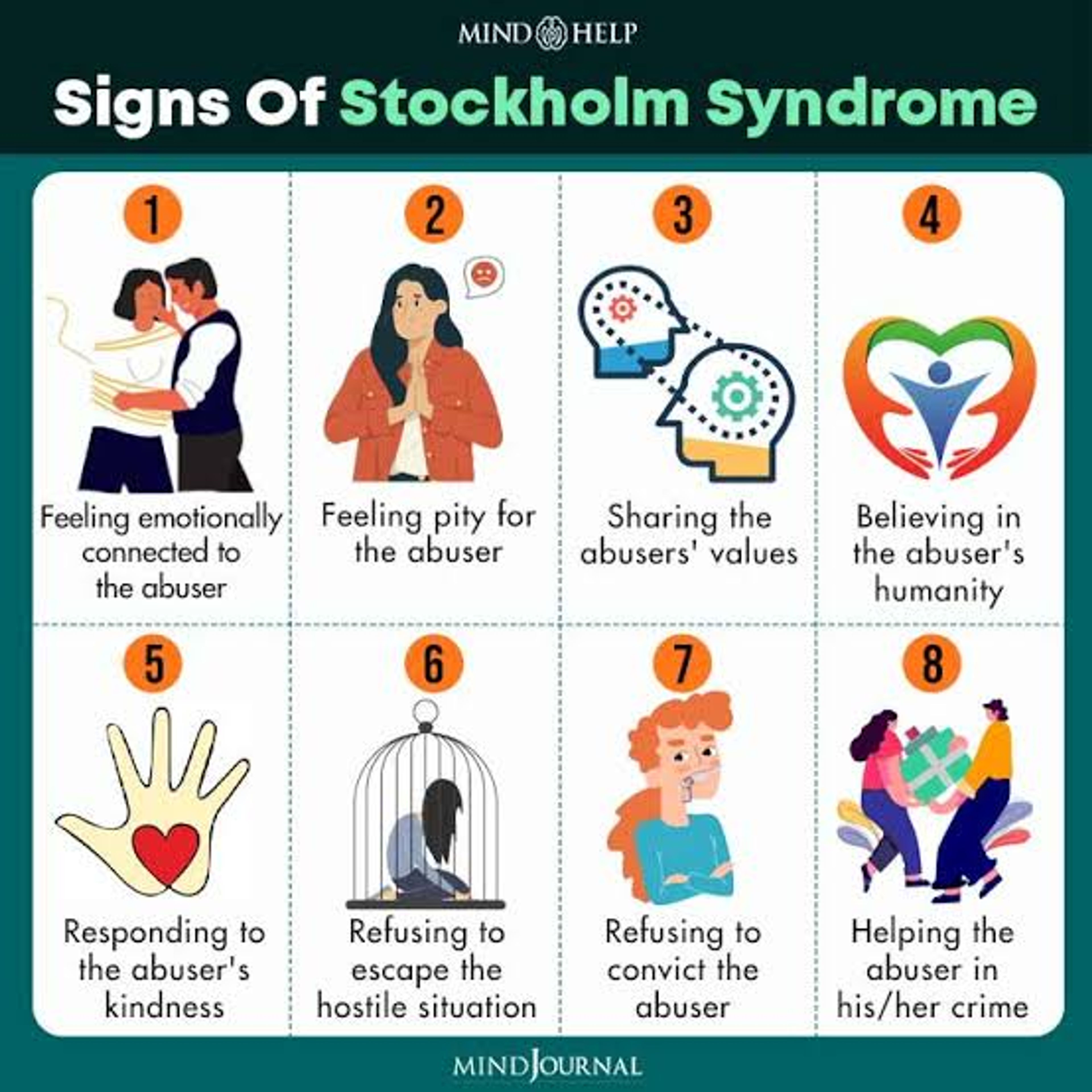 For instance, people who are kidnapped or taken hostage frequently perceive their captor as a threat, but they also depend heavily on them for survival needs like food, shelter, and company. If the kidnapper or abuser offers them some kindness, even as little as a concerned look, they might start to experience favorable emotions toward their captor for this alleged “compassion”.