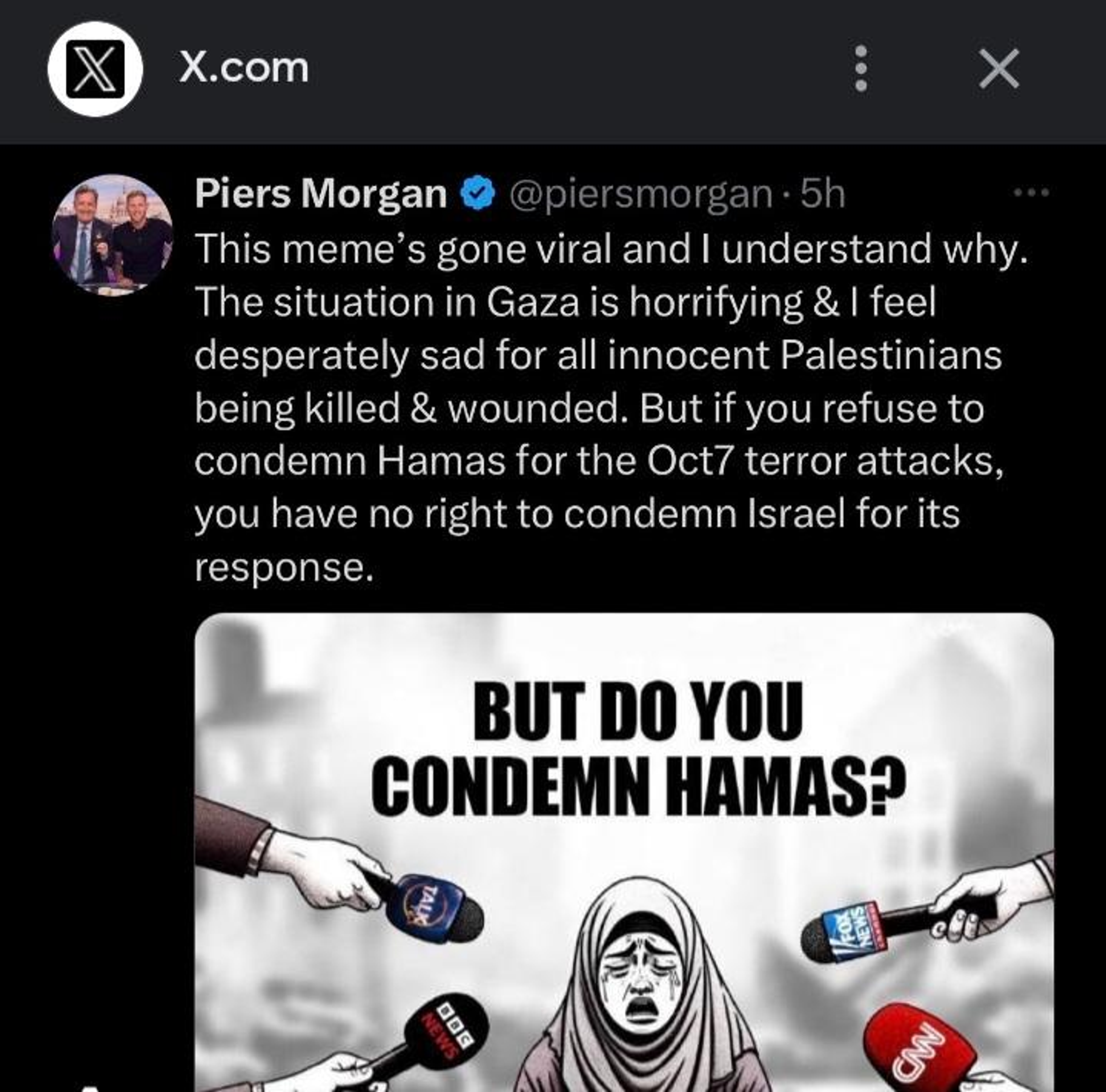 The condemnation of Hamas often serves as a prerequisite for discussing Palestinian suffering. One glaring example of this is how popular TV host Piers Morgan has asked each and every of his guests advocating for Palestine whether or not they condemn Hamas while no one representing Israel is asked if they condemn the heinous atrocities of the IDF in Gaza.