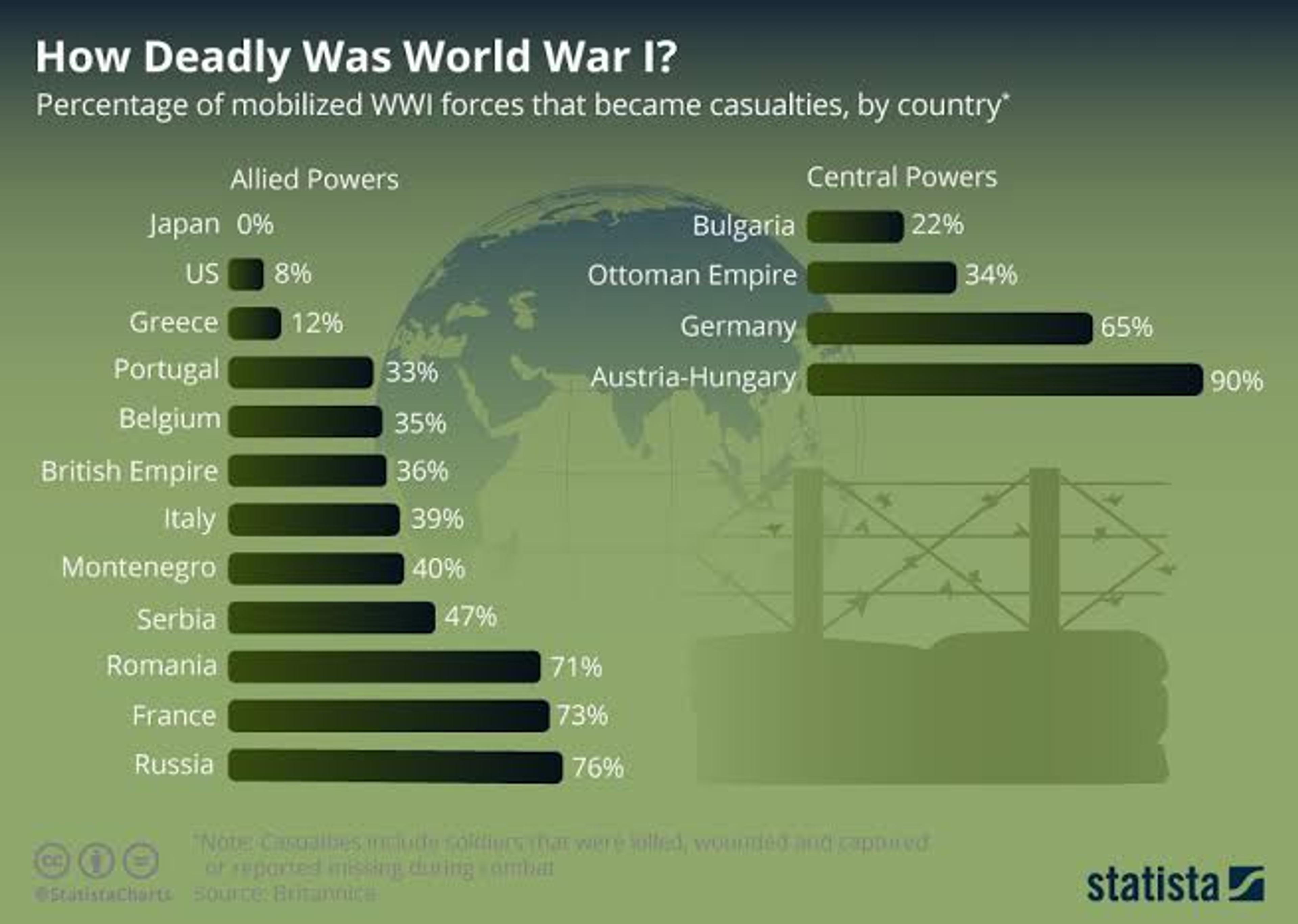 World War I (1914-1918) was the deadliest of all the wars that happened prior; the weapons were advanced and more countries were involved than any previous war. Over 9 million military personnel lost their lives, and over 7 million were left disabled. The economical balance of the world changed and inflation shot up in most countries. With troops travelling all over the world, an epidemic started which killed more than 25 million people across the world. People began to suffer from fatal diseases, and food shortage led to malnutrition.